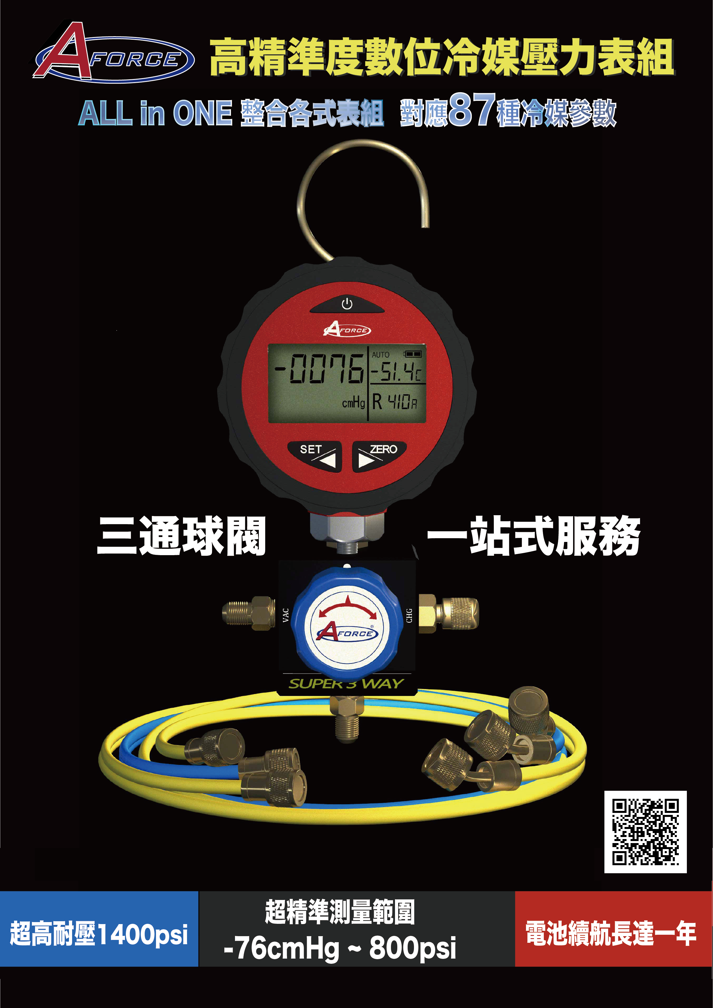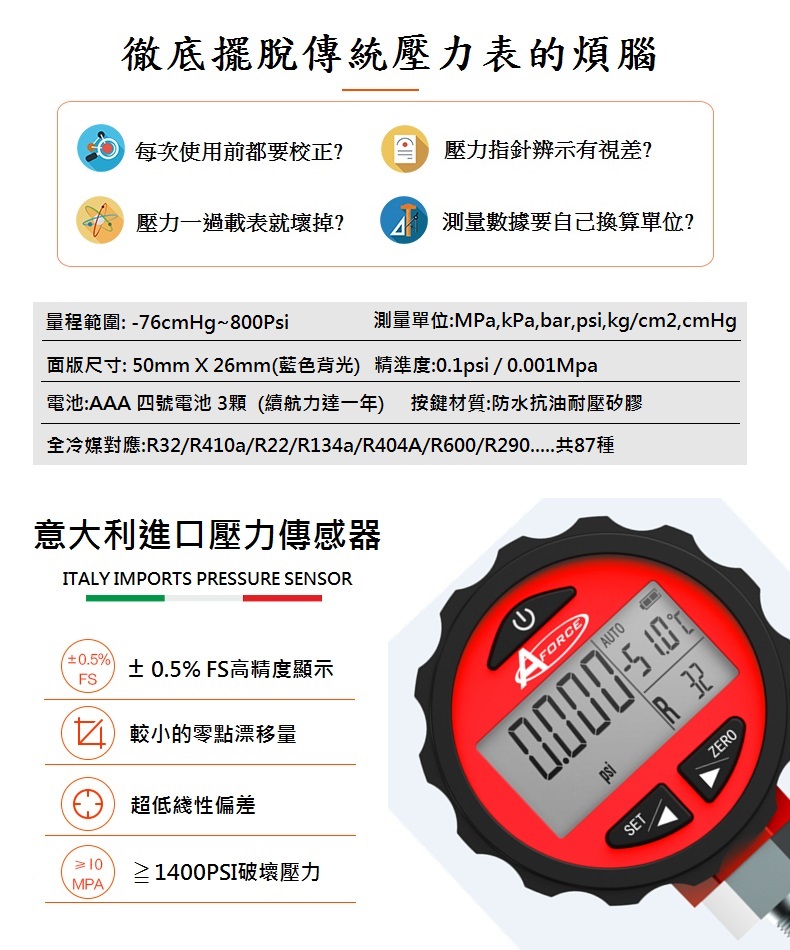 台灣AFORCE高精度數位冷媒壓力表(87種冷媒)AFDPG800