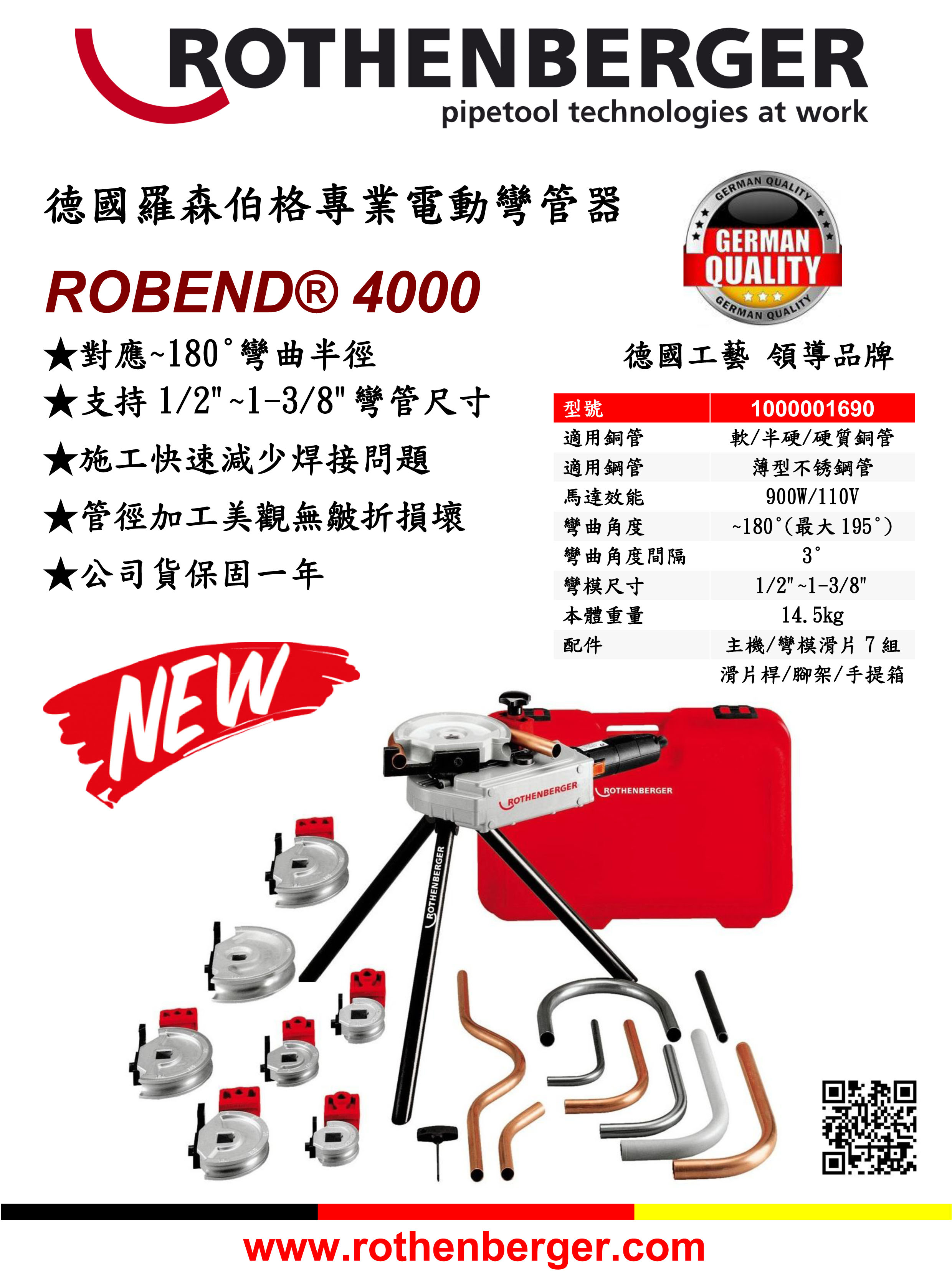 Rothenberger 電動彎管器組 德國品牌 支援1/2″, 5/8″, 3/4″, 7/8″,1", 1-1/8″, 1-3/8″ 彎曲半徑可達180度 適用於多種材質管路(軟/半硬/硬質銅管; 薄型不鏽鋼管) 馬達效能達900W/110VAC 附三角支架座,將彎管器架高(可另選配加高桿) 施工快速減少焊接問題 管徑加工美觀無皺折損壞 配件: 彎管器主機/彎模滑片7組/滑片桿/站立支架/手提箱 可另外加購彎模滑片組 公司貨保固一年