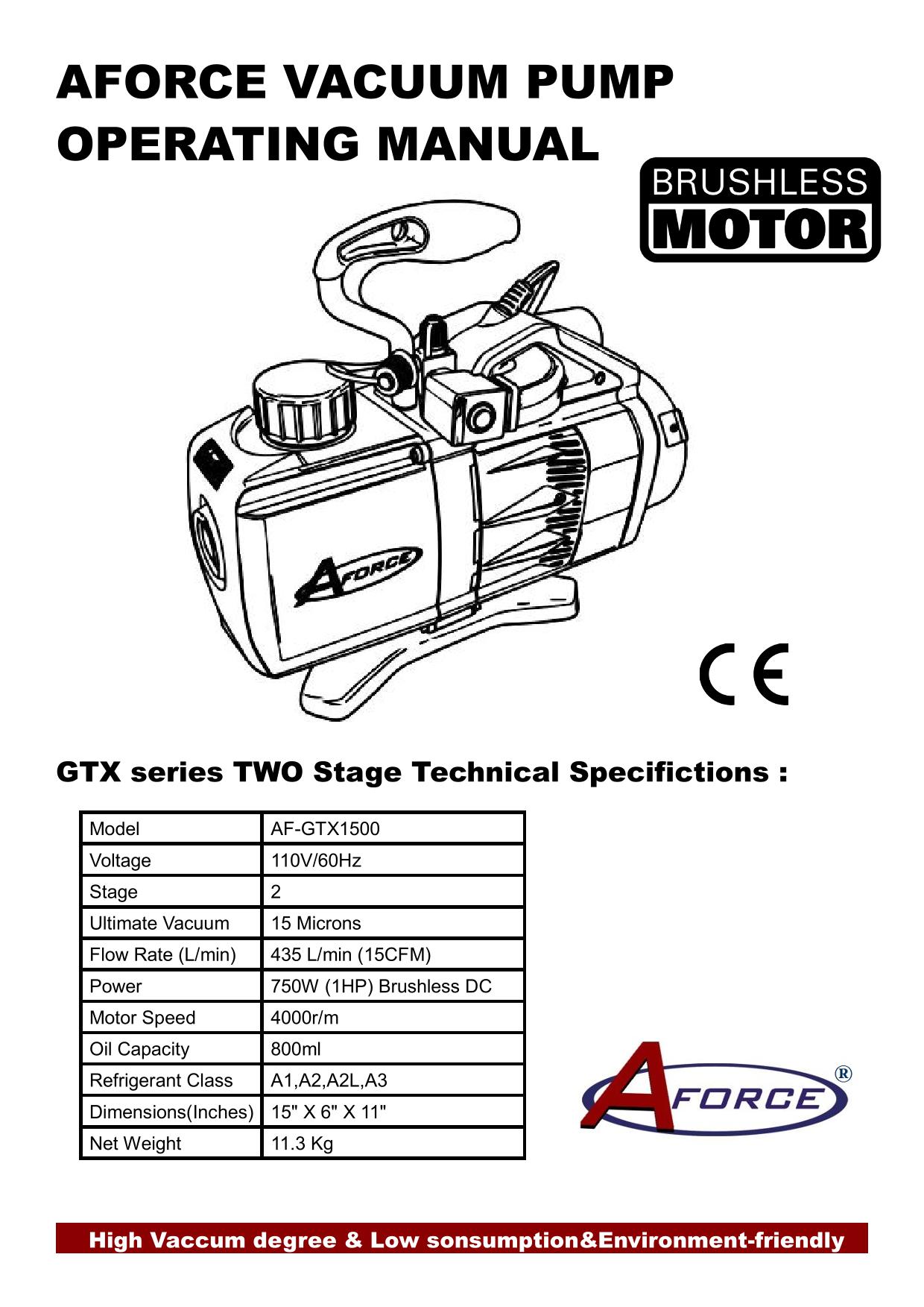 AFORCE 專業級1HP馬力雙段無刷真空機 NO.AF-GTX1500 ♦業界最輕巧1HP真空機 "超輕11.3Kg !!! " ♦業界最超速1HP真空機 "超速15CFM !!! "(435L/min) ♦業界超真空1HP真空機 "超低15Microns !!! " ♦採用精密永磁無刷馬達 超耐運轉24小時 !!! " ♦智能變頻防過熱造成真空度熱衰 "超智能保真空度!!! " ♦配備電磁逆止閥及電源線收納區收納超便利!!!
