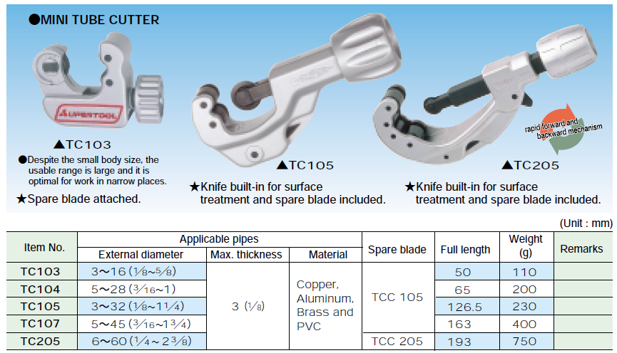 SUPERTOOL TC205 大切刀 (附備用刀片一片) 6~60mm , 1/4"~2-3/8" ★ 採用高硬度本體結構。 ★ 刀片採用特殊熱處理,具有卓越的切割能力及耐用度。 ★ 切割後大量減少毛邊產生。 ★ 全系列切刀皆為日本製造。 (注意!若在型號後加上"E"為非日本製造的簡易款且無備用刀片)