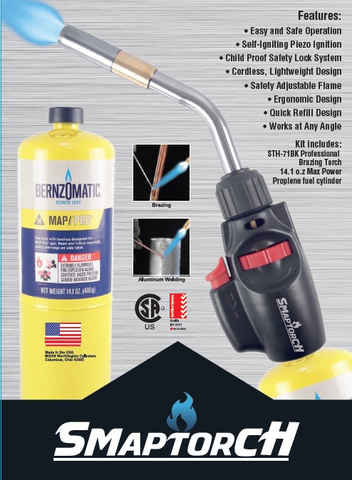 美國SMAPTORCH燒焊瓦斯組 (把手型簡配版) NO.STH-71BK ★全新配備掌上自動點火器及螺旋噴火頭特點! ★高效能火炬★輕便行動攜帶★燒焊角度不受限 產品特徵: 使用美國MAP//PRO黃色瓦斯燃點溫度可達1316℃。 內含美國MAP//PRO黃色瓦斯一罐。